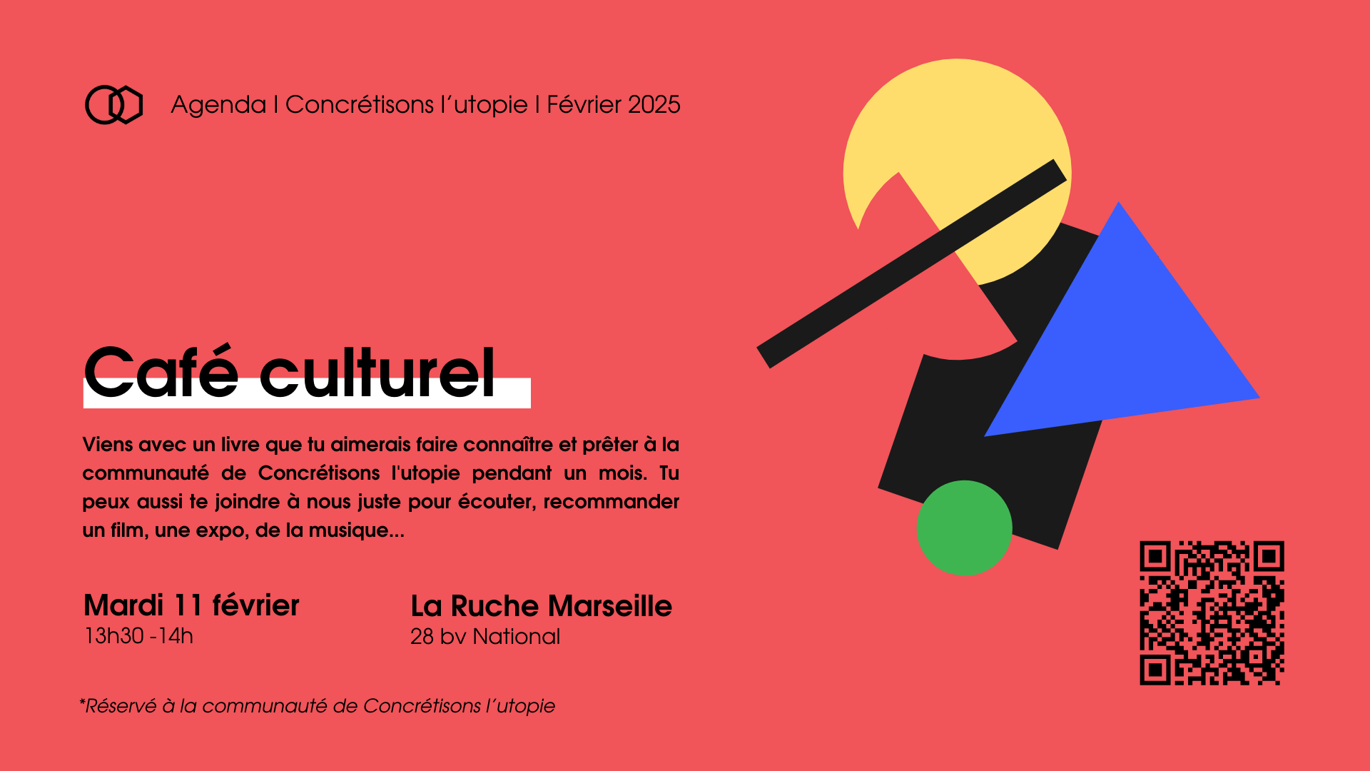 Viens avec un livre que tu aimerais faire connaître et prêter à la communauté de Concrétisons l'utopie pendant un mois. Tu peux aussi te joindre à nous juste pour écouter, recommander un film, une expo, de la musique...