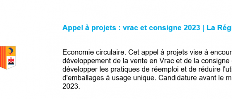 Economie circulaire. Cet appel à projets vise à encourager le développement de la vente en Vrac et de la consigne en vue de développer les pratiques de réemploi et de réduire l'utilisation d'emballages à usage unique. Candidature avant le mardi 14 Février 2023.