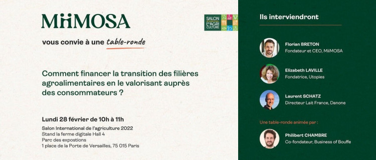A l’occasion du Salon International de l’Agriculture 2022, vous êtes convié.e.s à une table-ronde le lundi 28 février à 10h autour de la thématique suivante : « Comment financer la transition des filières agroalimentaires en le valorisant auprès des consommateurs ? ».