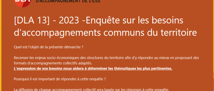 Le Dispositif Local d’Accompagnement des Bouches-du-Rhône (DLA 13) souhaite vous proposer de participer à la construction des accompagnements collectifs de l’année 2023.